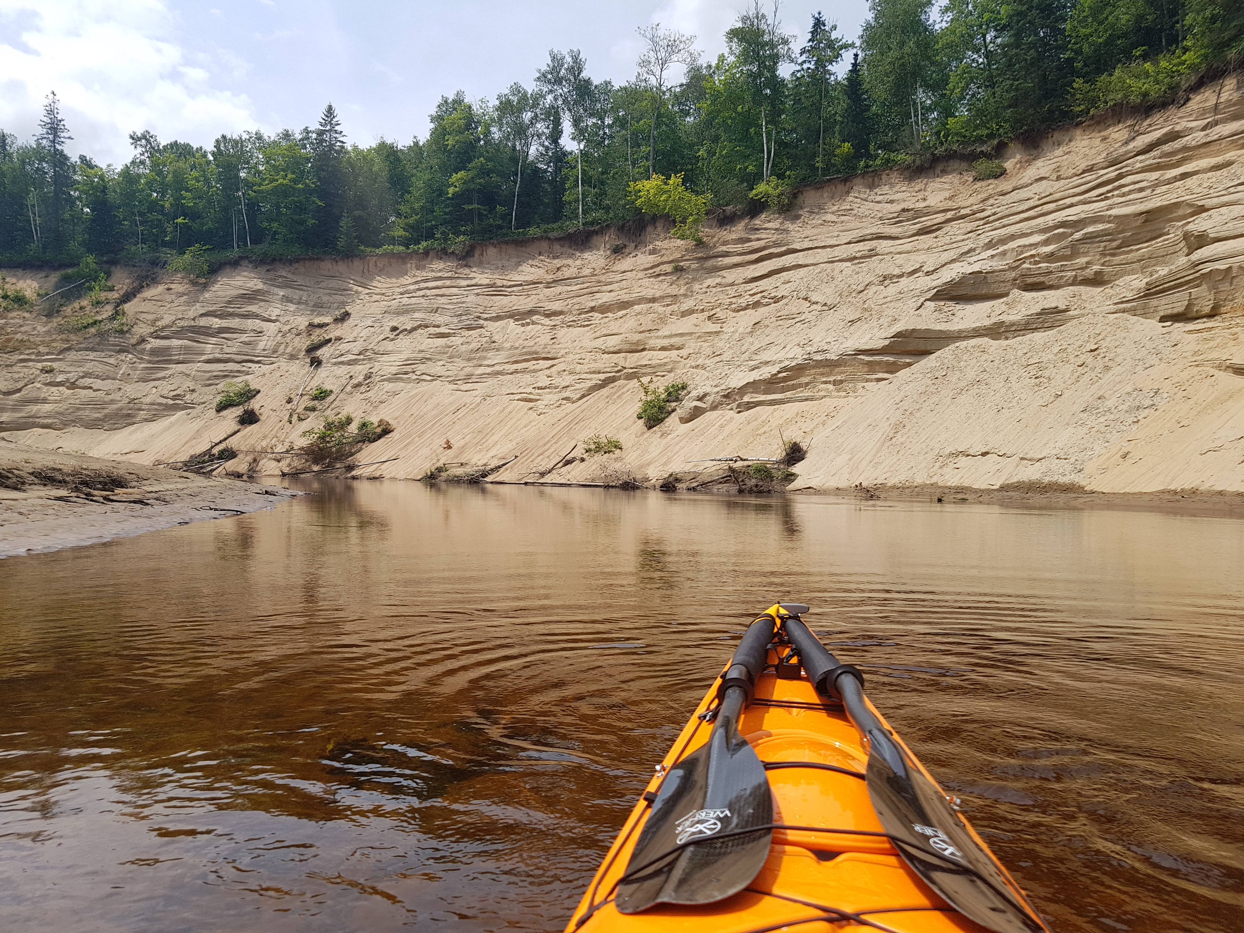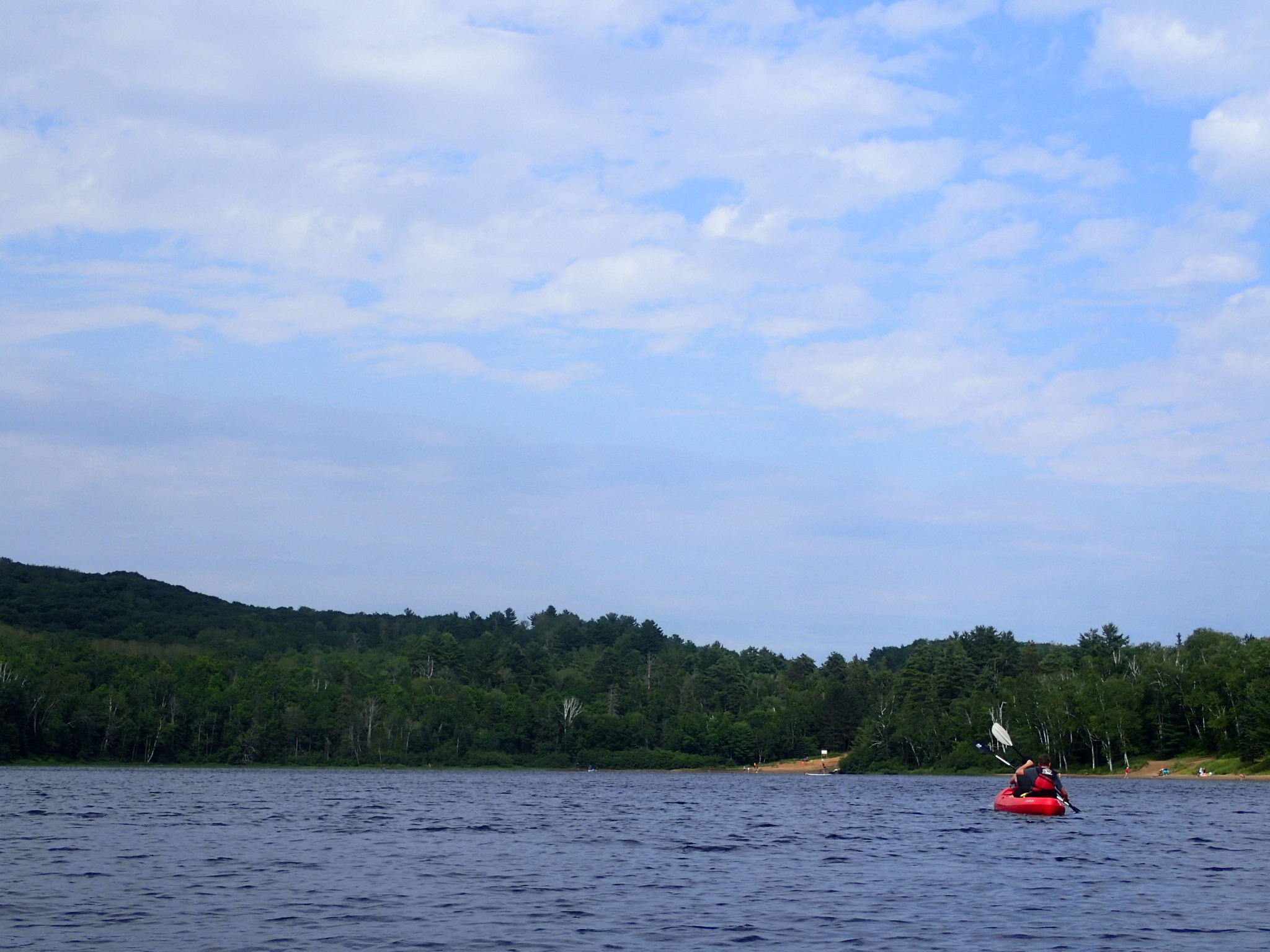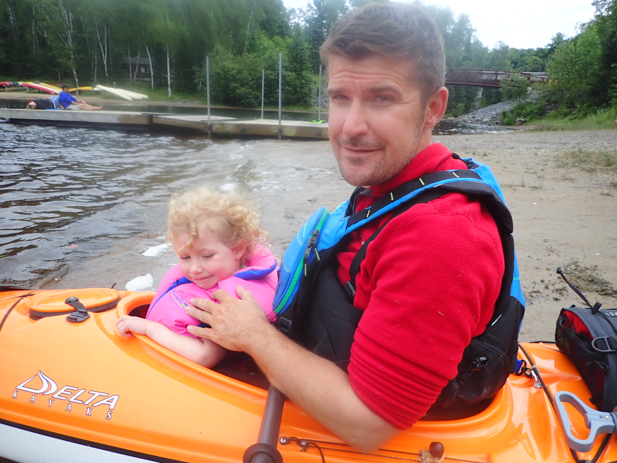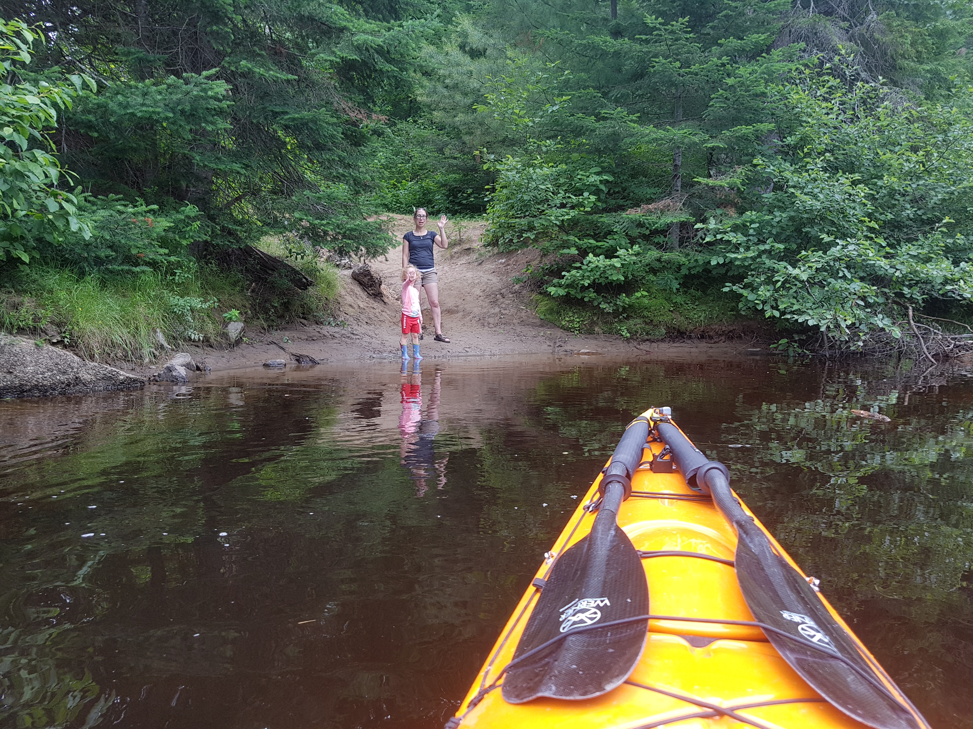 Into the kayak we went. The first thing we noticed was the colour of the water — like someone had left a giant tea bag in the lake. It made the scene feel atmospheric. We circled the lake slowly, stopping to look at every trillium, tree and rock face. Eventually Abbey decided that swimming on the beach outranked paddling up the Little East River.